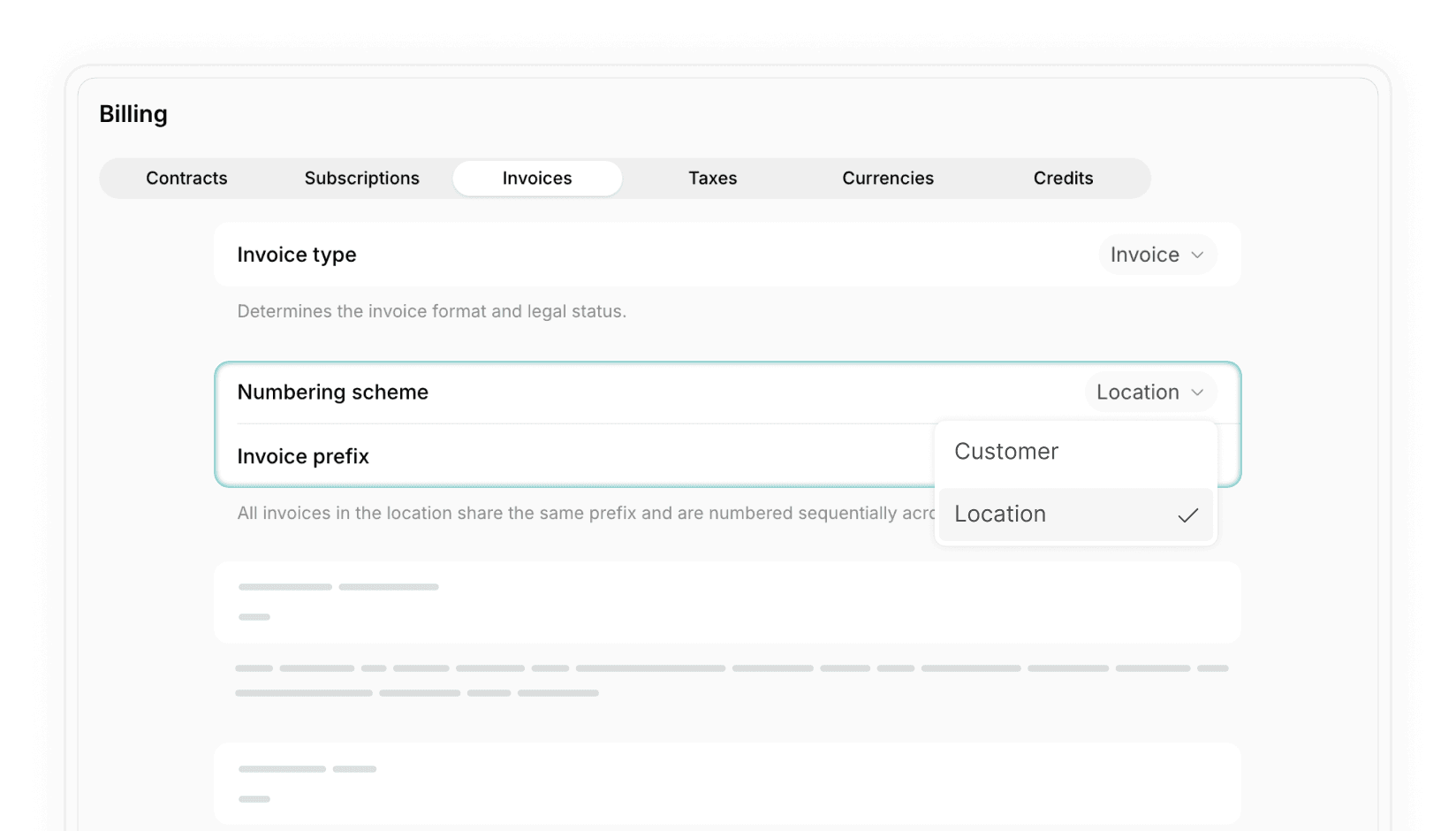 - Configure location-based invoice prefixes and sequential numbering to ensure clean financial records and maintain compliance with local accounting standards.