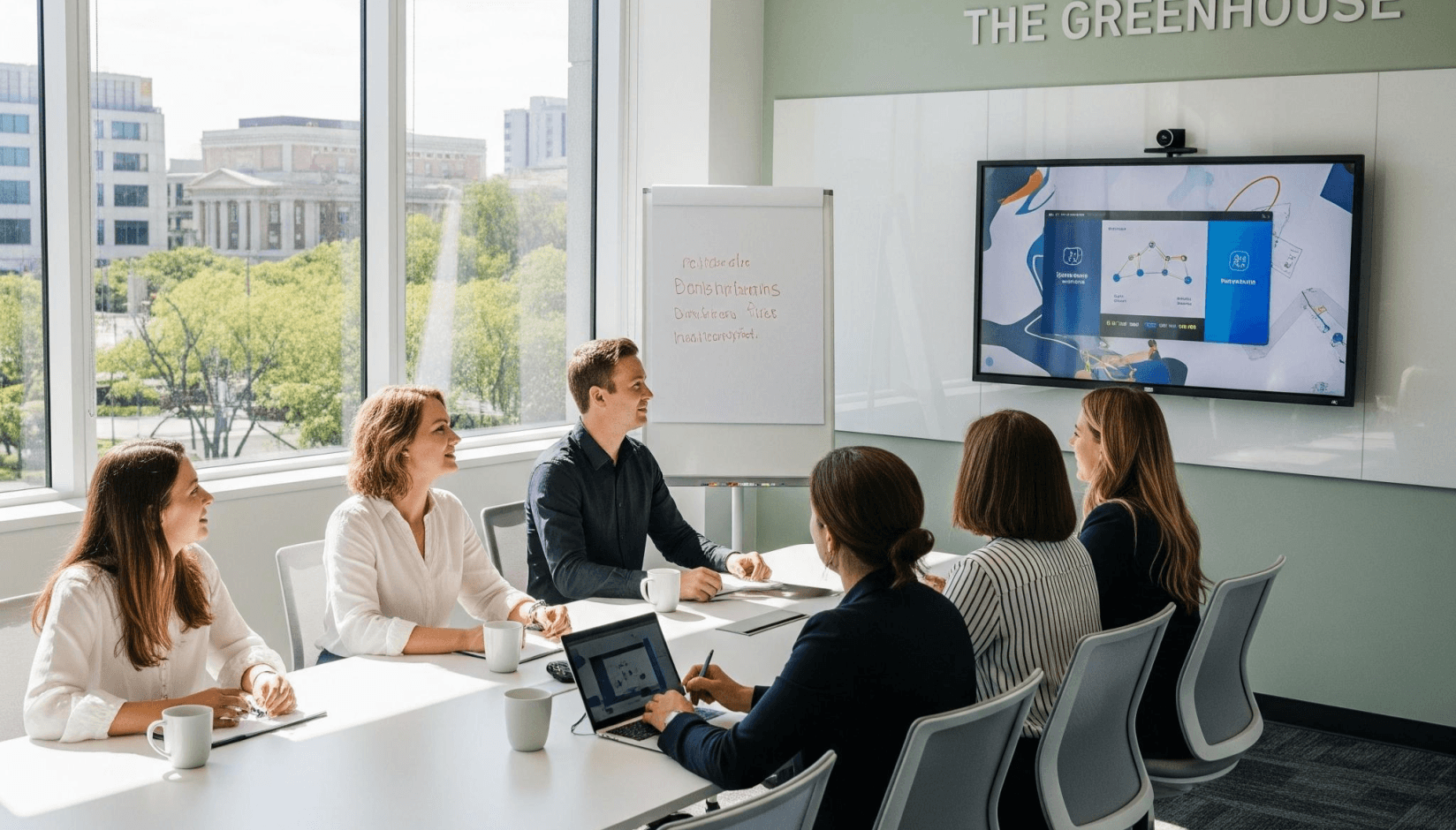 This is The Greenhouse, our go-to room for creative sessions. It’s a bright, focused space for up to six people with a huge whiteboard for mapping out ideas and a screen that’s super simple to connect to. The best part is the wall of windows—it just keeps the energy up all afternoon.