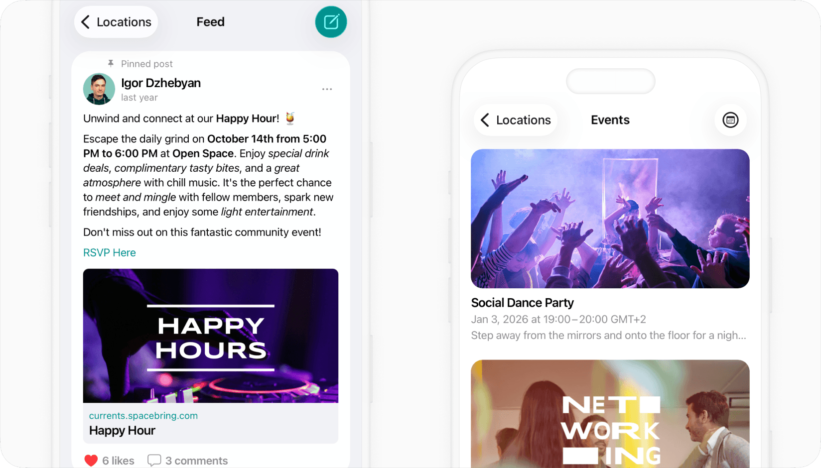 Spacebring functions like a niche social network. It features a dynamic community feed where members can: