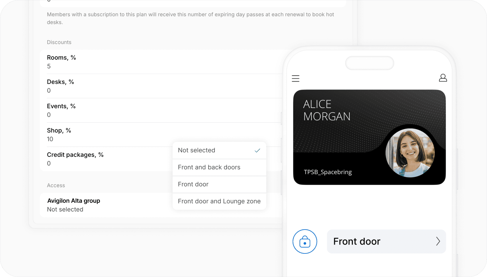 Spacebring integration with Avigilon Alta provides secure, automated access to your workspace. Customers automatically receive secure entry based on their active subscriptions and bookings, while administrators benefit from reduced manual management and improved oversight.