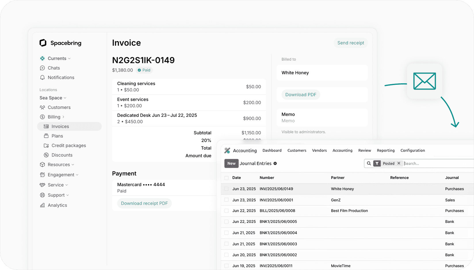 - Spacebring automatically sends all generated invoices to your unique Odoo Accounting email alias.