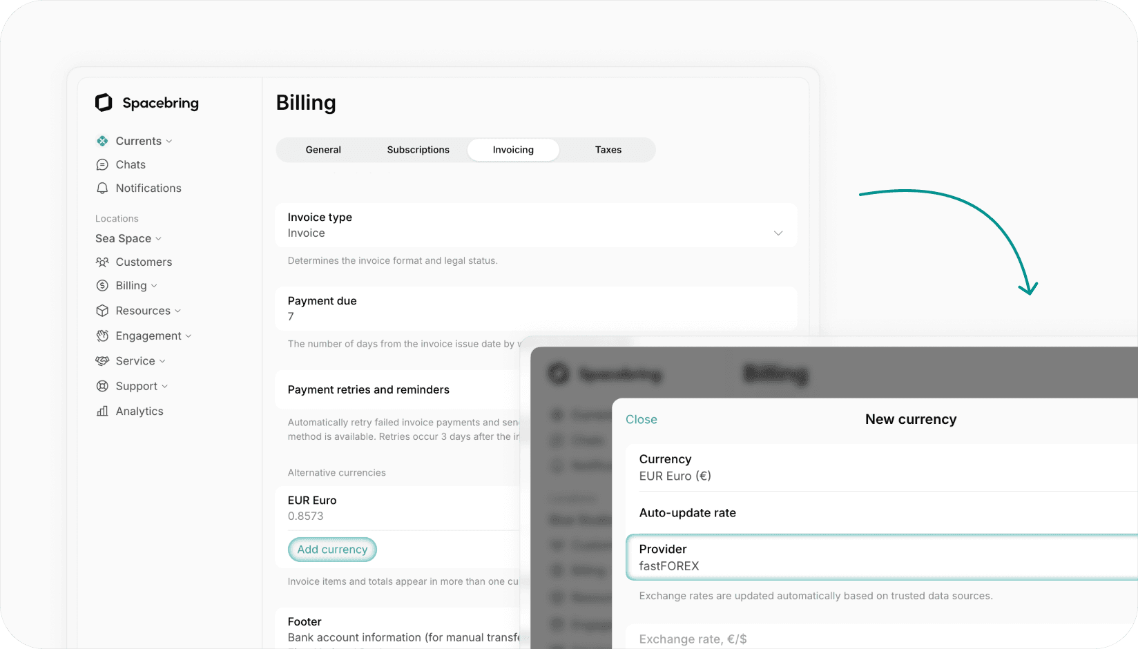 fastFOREX integration with Spacebring enables flexible multi-currency operations for coworking spaces and flexible offices. It allows you to display and issue invoices in alternative currencies for your members and companies, simplifying international collaboration and financial transparency.