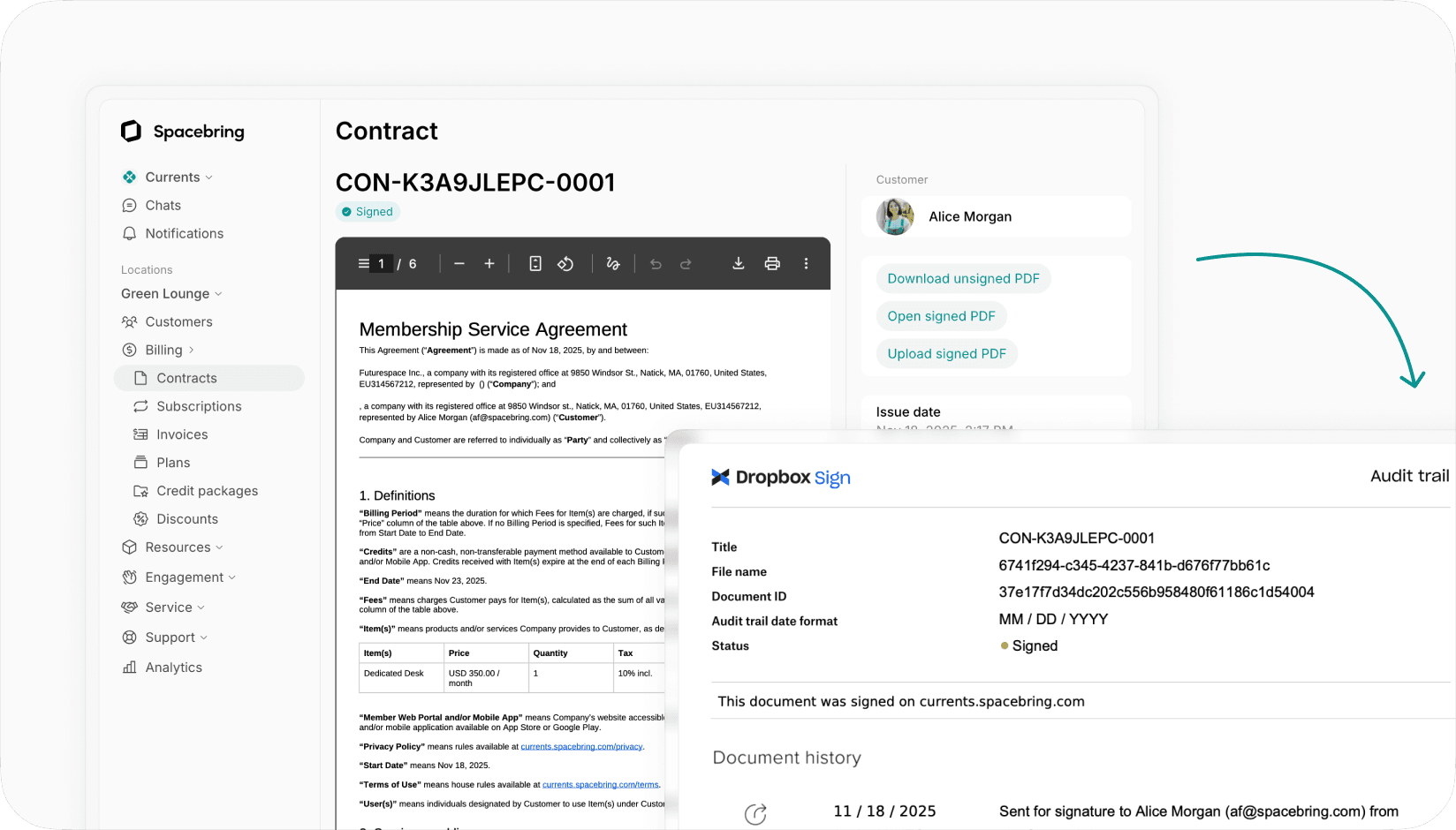 - Spacebring tracks the contract status in real-time, instantly updating you the moment a document is signed and starting a subscription.