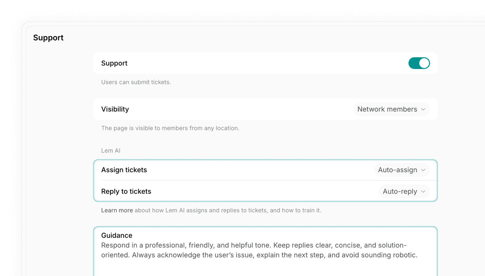 - Set custom guidance to define Lem AI’s exact tone, ensuring every reply matches your brand voice.
